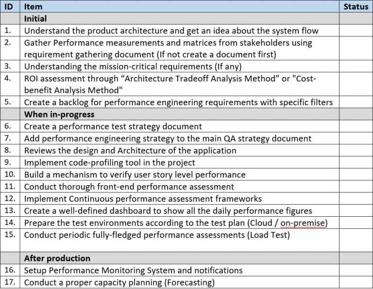 b. Add performance engineering strategy to the main QA strategy document – Then we can get the big picture of the quality activities we have to do (Assuming other areas such as Security, etc., are also there).