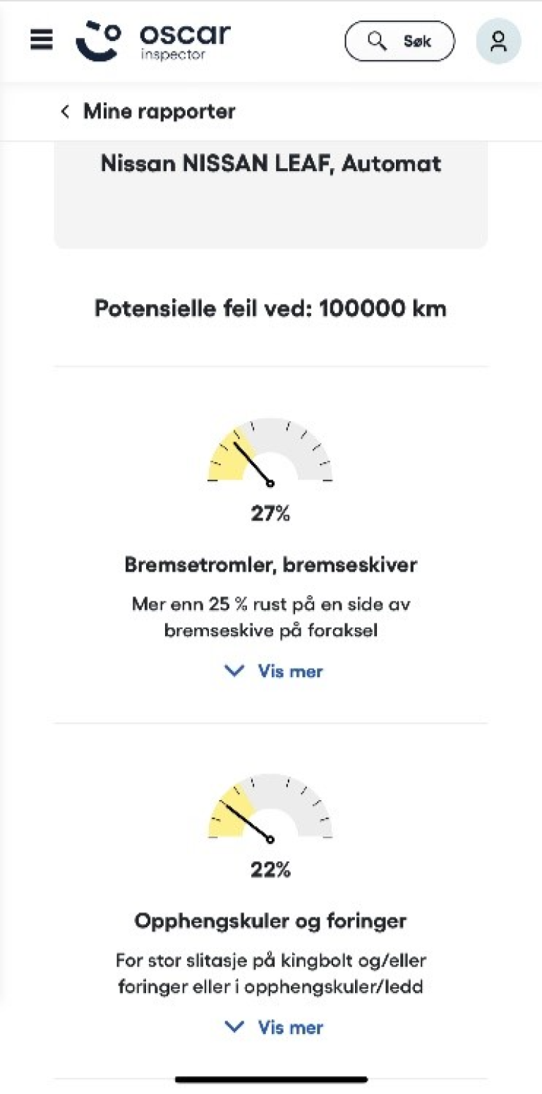 Shown here is a sample report for a Nissan Leaf clocking in at 100,000 km. Oscar Inspector has identified several issues for inspection and attention. In this case, the area needing the highest attention (27% probability) is on the brake drums and brake discs. If the vehicle service records show these have been recently replaced, the issue can be ignored. Other potential issues include rusting on the front axle, suspension and bushes and wear on the kingbolt and connected hinges/joints.
